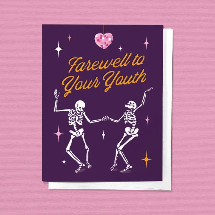 RIP to your 20s and your youth! This greeting card is the perfect way to wish someone a happy birthday. This greeting card features an illustration of dancing skeletons under a disco ball, with the phrase "Farewell To Your Youth"