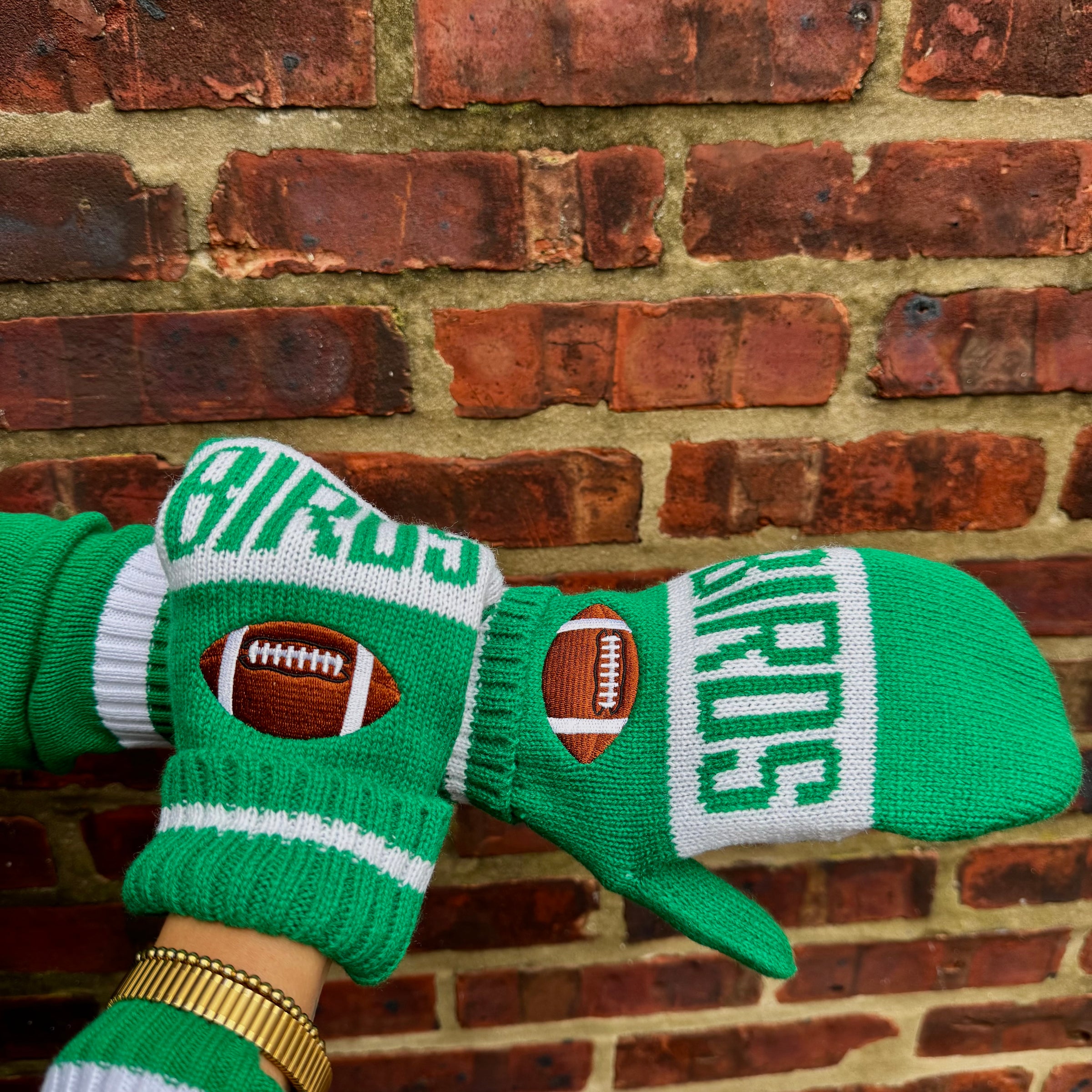 Wrap your hands in game-day spirit with these cozy Eagles "Birds" Mittens! Perfect for cheering on your team through the winter season, these oversized mittens feature bold screen-printed bird graphics and an embroidered football detail.