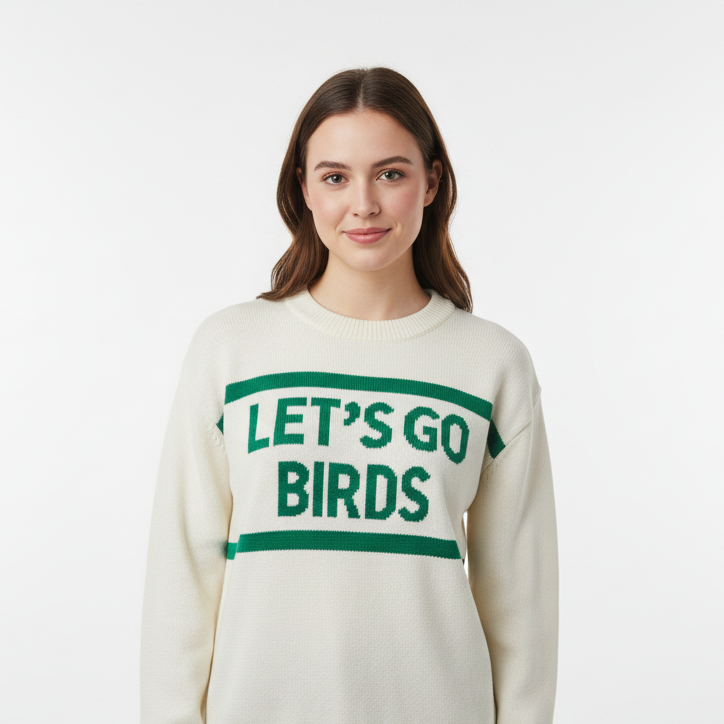 Show your Philly pride in cozy style with our "Let's go Birds" Knit Sweater - the perfect blend of comfort, warmth, and game-day energy. This classic white sweater features bold green lettering that proudly shouts the rallying cry of every true Eagles fan.