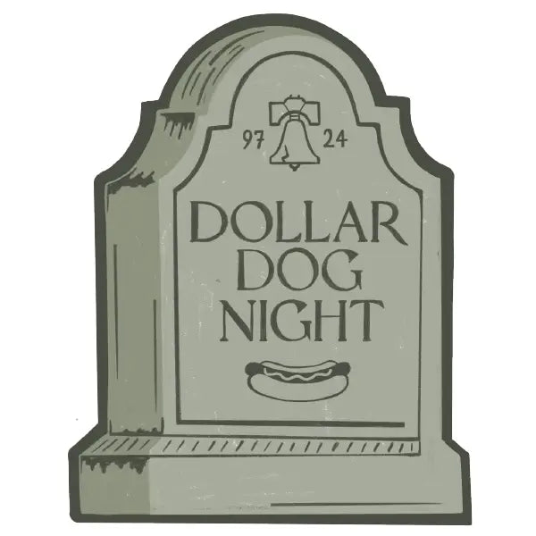 Rest in peace to Dollar Dog Night. May we remember them and the Philadelphia Phillies. This sticker is an illustration of a tombstone with the phrase "RIP Dollar Dog Night"