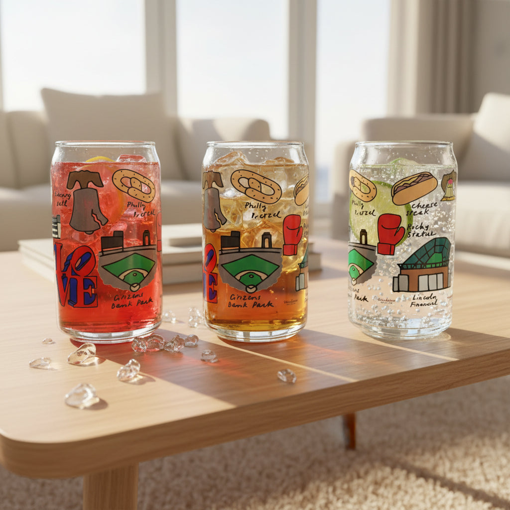 Raise a glass to the city where history lives. The illustrations on this can pint glass highlight classic Philly symbols, including the towering architecture of Philadelphia City Hall, the unmistakable twist of a Philadelphia soft pretzel, and the world-famous Philly cheesesteak. Together, these elements celebrate the culture, food, and history that make Philadelphia one of America's most iconic cities.