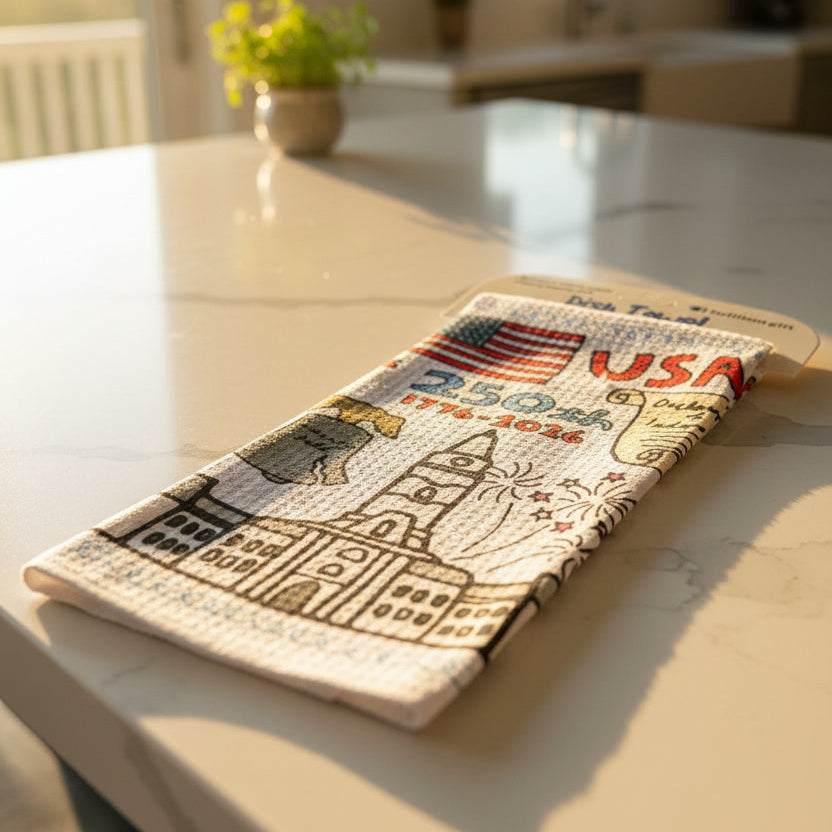 Celebrate American heritage with this Philadelphia patriotic dish towel, designed to honor the nation's 250th anniversary. Featuring iconic imagery of the Liberty Bell, Declaration of Independence, and beloved Philadelphia landmarks, this waffle knit towel brings historical pride to your kitchen.